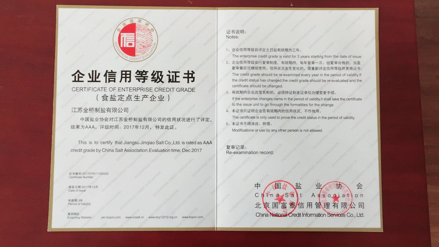 按照主營(yíng)業(yè)務(wù)收入、利潤(rùn)、主營(yíng)業(yè)務(wù)收入利稅率及主營(yíng)業(yè)務(wù)增速四項(xiàng)指標(biāo)評(píng)價(jià),2016年集團(tuán)公司被中國(guó)輕工業(yè)聯(lián)合會(huì)和中國(guó)鹽業(yè)協(xié)會(huì)評(píng)為中國(guó)輕工業(yè)制鹽行業(yè)十強(qiáng)企業(yè)。根據(jù)《社會(huì)信用體系建設(shè)規(guī)劃綱要(2014—2020)》,經(jīng)第三方專(zhuān)業(yè)評(píng)價(jià)機(jī)構(gòu)和中國(guó)鹽業(yè)企業(yè)信用等級(jí)評(píng)價(jià)委員會(huì)審核并向社會(huì)公示,2016年江蘇金橋制鹽有限公司被評(píng)為AAA級(jí)食鹽生產(chǎn)企業(yè)。