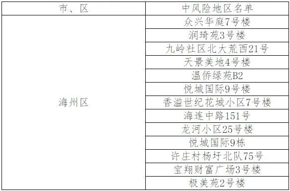 根據(jù)國務院聯(lián)防聯(lián)控機制有關(guān)規(guī)定,經(jīng)綜合評估研判,市指揮部決定,自發(fā)布之日起,將龍河小區(qū)25號樓、悅城國際9棟、許莊村楊圩北隊75號、寶翔財富廣場3號樓、極美苑2號樓調(diào)整為中風險地區(qū)。