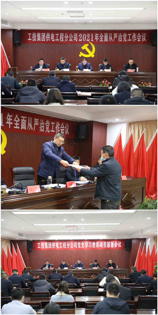 上半場(chǎng),在公司2021年全面從嚴(yán)治黨工作會(huì)議上,全體參會(huì)人員首先觀看了全面從嚴(yán)治黨工作警示教育片。隨后,黨委書(shū)記、經(jīng)理孫政權(quán)在題為《強(qiáng)化政治建設(shè) 聚焦深度融合 以大黨建引領(lǐng)公司高質(zhì)量發(fā)展新征程》的黨委工作報(bào)告中指出,過(guò)去的一年,面對(duì)新冠疫情和經(jīng)濟(jì)下行的雙重壓力,公司黨委深入學(xué)習(xí)貫徹習(xí)近平新時(shí)代中國(guó)特色社會(huì)主義思想,以“不忘初心、牢記使命”主題教育為主線,扎實(shí)開(kāi)展“雙融雙創(chuàng)”黨內(nèi)主題教育實(shí)踐活動(dòng),壓實(shí)管黨治黨責(zé)任、勇于直面困難挑戰(zhàn),推動(dòng)公司經(jīng)濟(jì)在逆境中取得突破,黨建工作取得了顯著成效。報(bào)告強(qiáng)調(diào),2021年黨委工作的指導(dǎo)思想是:深入學(xué)習(xí)貫徹習(xí)近平新時(shí)代中國(guó)特色社會(huì)主義思想、十九屆五中全會(huì)精神等內(nèi)容,以“全面從嚴(yán)治黨”為統(tǒng)領(lǐng),以“黨史學(xué)習(xí)教育”為主線,以打造“工電先鋒”黨建品牌為抓手,扎實(shí)開(kāi)展“奮進(jìn)新時(shí)代、領(lǐng)航開(kāi)新篇”黨內(nèi)主題教育活動(dòng),以“大黨建”整合力量、凝聚人心,發(fā)揮黨的關(guān)鍵引領(lǐng)作用,將黨的政治優(yōu)勢(shì)轉(zhuǎn)化為發(fā)展優(yōu)勢(shì)。團(tuán)結(jié)帶領(lǐng)廣大干部員工,統(tǒng)一思想、凝聚力量,勇于擔(dān)當(dāng)、開(kāi)拓進(jìn)取,加大改革創(chuàng)新、轉(zhuǎn)型升級(jí)、管理提升推動(dòng)力度,開(kāi)創(chuàng)工投供電高質(zhì)量發(fā)展新局面,以改革發(fā)展優(yōu)異成績(jī)向建黨100周年獻(xiàn)禮,為扛起“爭(zhēng)當(dāng)表率、爭(zhēng)做示范、走在前列”重大使命、奪取“十四五”發(fā)展開(kāi)局首勝作出貢獻(xiàn)。圍繞上述總體要求,重點(diǎn)做好五個(gè)方面工作:持續(xù)深化政治建設(shè),推進(jìn)黨建經(jīng)濟(jì)深度融合;持續(xù)強(qiáng)化基層基礎(chǔ),構(gòu)建企業(yè)大黨建格局;持續(xù)推進(jìn)人才隊(duì)伍建設(shè),增強(qiáng)高質(zhì)量發(fā)展推動(dòng)力;持續(xù)推進(jìn)黨風(fēng)廉政建設(shè),推進(jìn)全面從嚴(yán)治黨向縱深發(fā)展;持續(xù)推進(jìn)和諧企業(yè)創(chuàng)建,維護(hù)和諧穩(wěn)定發(fā)展的良好局面。