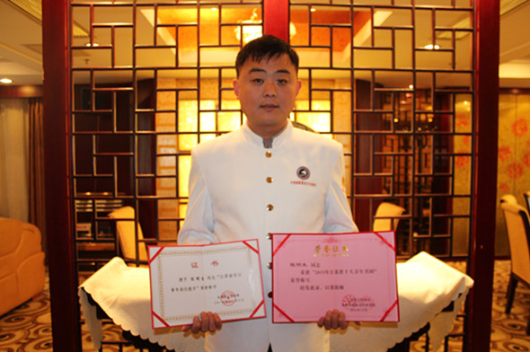 由共青團(tuán)江蘇省委員會(huì)、江蘇省烹飪協(xié)會(huì)聯(lián)合舉辦的2015年度“江蘇省十大青年名廚”評(píng)選活動(dòng)的結(jié)果,日前在蘇州開(kāi)幕的江蘇省第二屆廚師節(jié)上揭曉,淮鹽大酒店廚師長(zhǎng)陳明生被評(píng)為“江蘇省十大青年名廚”,他還同時(shí)被共青團(tuán)江蘇省授予“江蘇省青年崗位能手”稱號(hào)。此次活動(dòng)參評(píng)選手須是江蘇省烹飪大師或江蘇省烹飪名師以上,具有技師或高級(jí)技師技術(shù)職稱,且年齡在35周歲以下的青年廚師。由專家評(píng)審團(tuán)根據(jù)選手參加賽事獲獎(jiǎng)情況及為全省或地方等方面進(jìn)行綜合評(píng)估,最終評(píng)出江蘇省十大青年名廚。(陳明生)