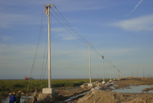 連云新城三期供電線路緊貼海堤邊。受海堤建設(shè)進(jìn)度和海風(fēng)海潮的影響,低矮的壩堤經(jīng)常被風(fēng)刮起的海浪浸頂,石塊突起,洼水漣漪,淤泥纏足,堤邊路面凹凸不平,道路僅限一輛車通行,擁擠不堪,工程施工難度極大。為提升速度,加快進(jìn)度,臺(tái)北供電所克服困難,緊鑼密鼓地展開工作,以期早日完工?,F(xiàn)場(chǎng)勘察地形地貌,了解潮汐運(yùn)動(dòng)規(guī)律,制定施工計(jì)劃,設(shè)計(jì)措施方案,組織人力,采購(gòu)材料,投入施工。施工人員采用彈性工作時(shí)間,利用落潮時(shí)機(jī),搶運(yùn)電桿,及時(shí)立桿和裝配。職工們發(fā)揚(yáng)不怕苦,不畏難的精神,不懼海風(fēng)吹臉、海水浸衣,爬上距離海平面二十多米仿佛搖擺不定的高桿,懸在空中一絲不茍地操作,保障了工程的全面竣工。
