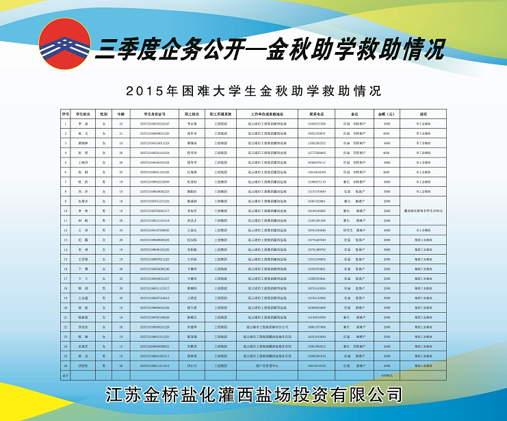 三季度,公司黨委積極做好走訪慰問、送溫曖工作,灌西鹽場投資公司、日曬制鹽公司對30名困職工發(fā)放陽光救助金30000元;對15名患重大疾病困職工及直系親屬發(fā)放救助金15000元;對26名困難大學(xué)生實(shí)行金秋助學(xué)金67000元。具體情況請查看公示展板。