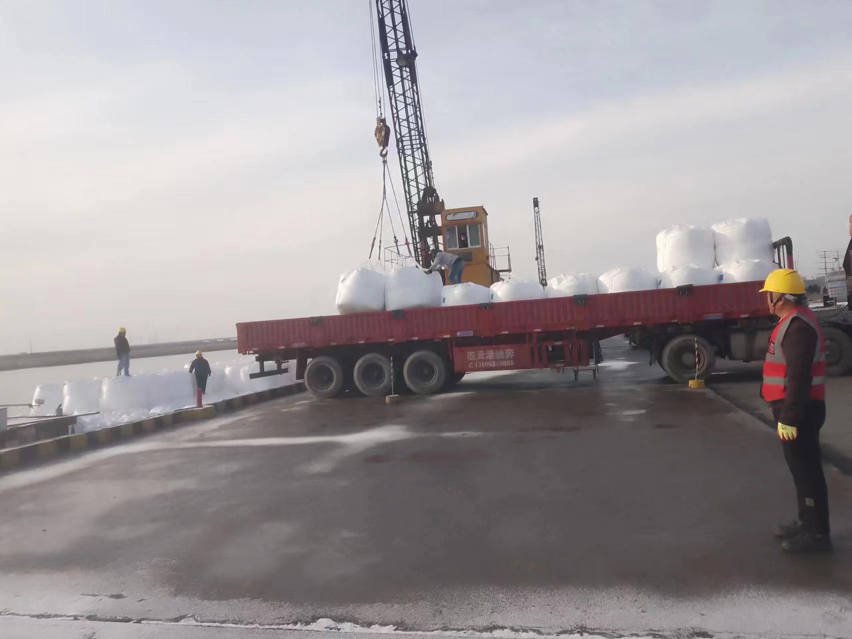 一個(gè)個(gè)白色的大包被吊裝到??吭诖a頭的貨船上,裝卸員工在熱火朝天的忙碌著,從卸船、裝車、掛鉤、堆碼,每個(gè)環(huán)節(jié)都細(xì)致入微。在碼頭一號(hào)塔吊的作業(yè)現(xiàn)場(chǎng),土方駁運(yùn)也在施工操作,挖掘機(jī)舞動(dòng)長(zhǎng)臂,旋轉(zhuǎn)作業(yè),機(jī)械設(shè)備有序運(yùn)轉(zhuǎn),轟嗚不息,安全員在現(xiàn)場(chǎng)管理,不時(shí)發(fā)出指令作業(yè),做好土方驗(yàn)收的同時(shí),提醒駕駛員在雨雪天氣,注意防滑,安全行駛,為順利完成年度100萬(wàn)噸吞吐量奠定堅(jiān)實(shí)的基礎(chǔ),同時(shí)夯實(shí)來(lái)年碼頭高質(zhì)高效生產(chǎn)。(胡秀同)