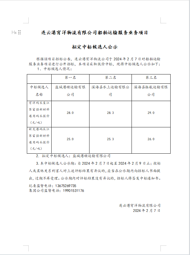 連云港宵洋物流有限公司船舶運(yùn)輸服務(wù)業(yè)務(wù)項(xiàng)目擬定中標(biāo)候選人公示