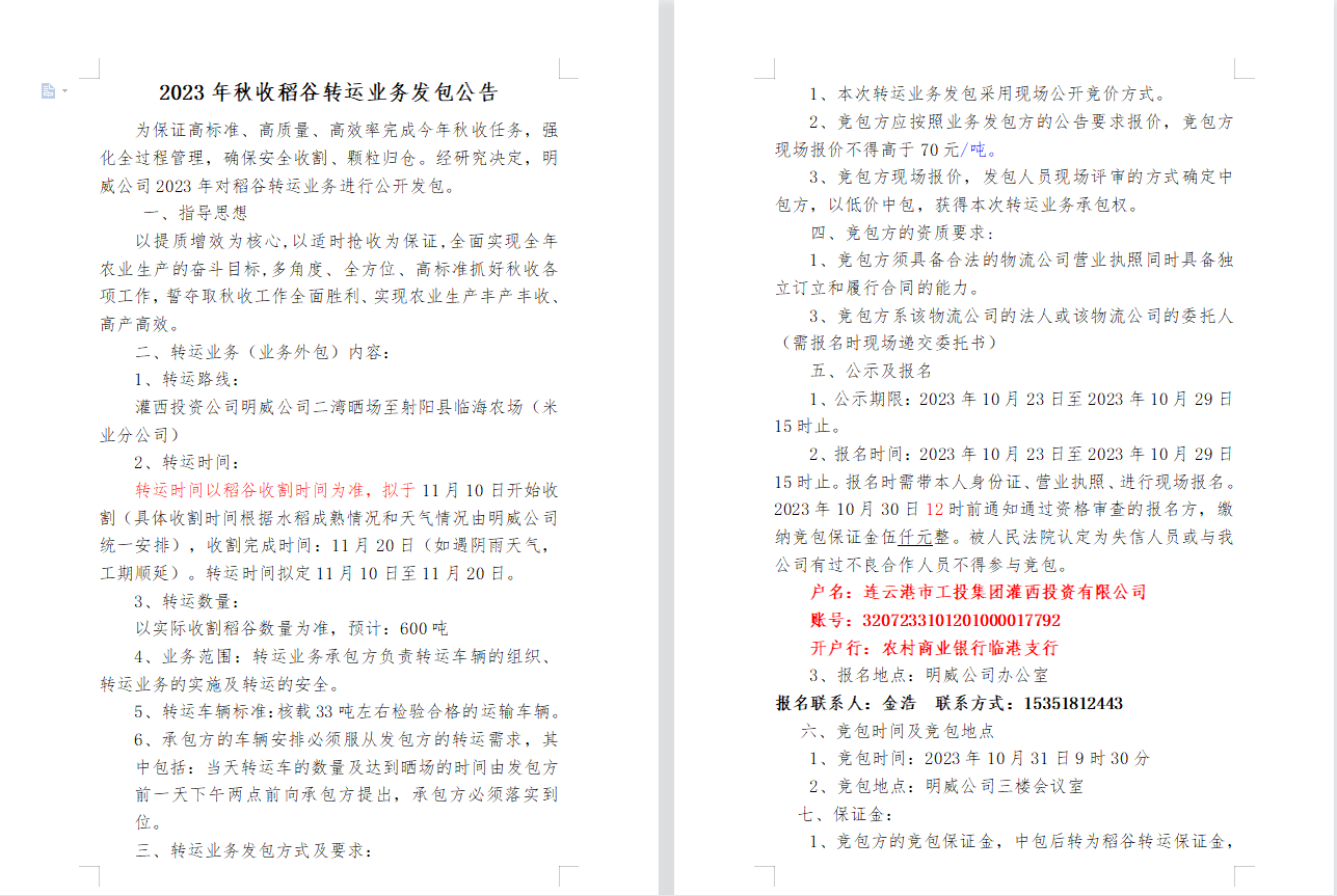 2023年秋收稻谷轉(zhuǎn)運業(yè)務(wù)發(fā)包公告