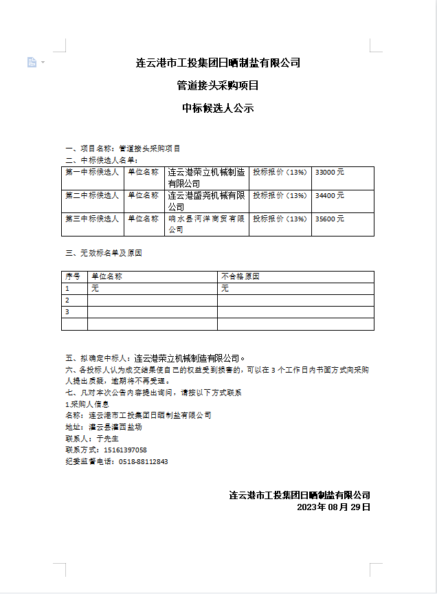 連云港市工投集團(tuán)日曬制鹽有限公司 管道接頭采購(gòu)項(xiàng)目中標(biāo)候選人公示