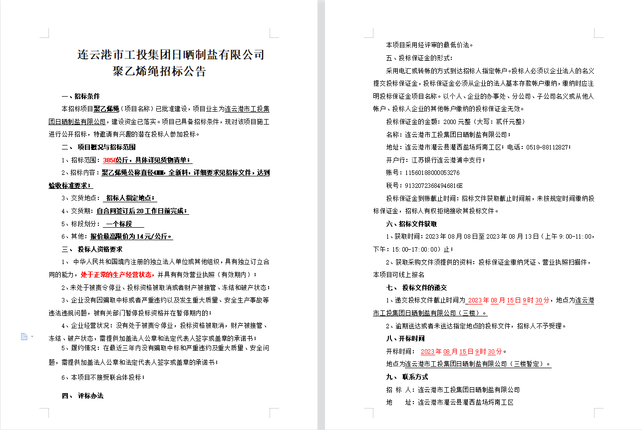 連云港市工投集團日曬制鹽有限公司聚乙烯繩招標(biāo)公告