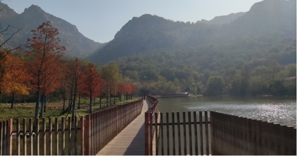 斗轉(zhuǎn)星移,山河已變,五百年前詩(shī)人所描述的風(fēng)景我們無(wú)法再欣賞到,但是現(xiàn)在的園林水庫(kù)更有一番風(fēng)采?;鸺t的水杉是她最引人注目的特色之一,寒風(fēng)掠過(guò),水杉的葉子也逐漸變成了鮮艷的火紅色,猶如一片片燃燒的火焰,在寒冷的季節(jié)中增添了一抹暖色。徜徉于火紅的水杉林,陽(yáng)光下樹(shù)影婆娑,寧?kù)o,安逸,沉醉于詩(shī)畫(huà)中。波光粼粼的湖水更是一幅美妙的畫(huà)卷,清澈透明,水草搖曳,微波蕩漾,游魚(yú)穿梭,仿佛寒冷與它們無(wú)關(guān)。棧橋嫻熟地穿越著園林與水庫(kù),一直連接到山腳,行走其上,腳下水光瀲滟,眼前層林盡染,晴空之下無(wú)一絲塵埃,啾啾鳥(niǎo)鳴,沙沙葉響,嘩嘩水流,大自然的樂(lè)章歡快靜謐。
