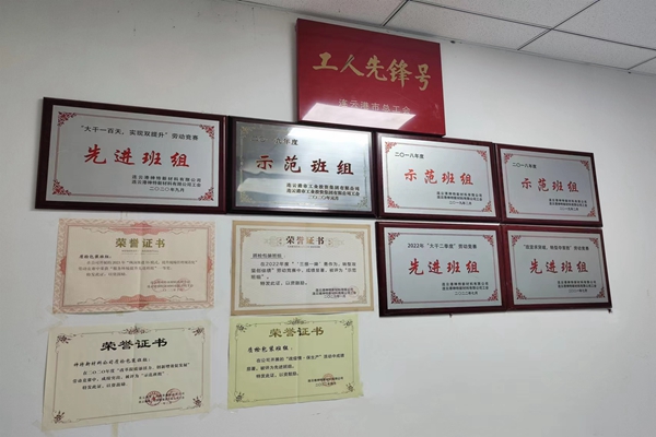 走進(jìn)質(zhì)檢辦公室,首先映入眼簾的就是這面榮譽墻,上面有近年來集團(tuán)頒發(fā)的“示范班組”和公司授予的各種榮譽,還有一塊金字招牌,就是市總工會頒發(fā)的“工人先鋒號”。