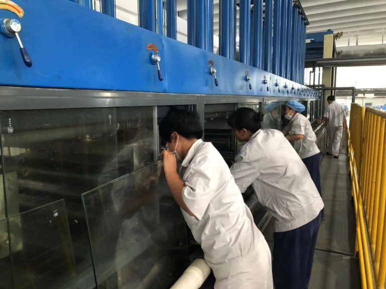 開展生產(chǎn)線設(shè)備清理工作。后紡員工無懼炎熱天氣,擼起袖子加油干,面臨萃取機(jī)內(nèi)部空間狹小難清理難題時(shí),身材精瘦的員工爭(zhēng)相進(jìn)入萃取機(jī)內(nèi)部進(jìn)行清理作業(yè),形成“愛企奉獻(xiàn)”工作氛圍。