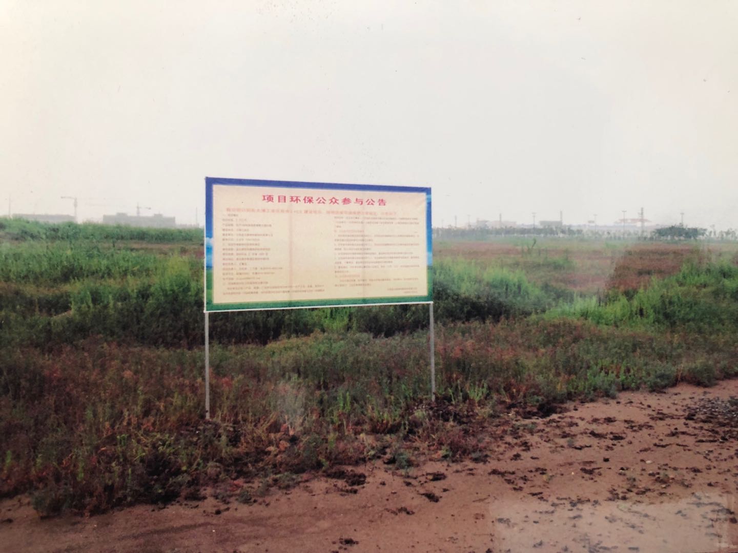 這是神特公司籌建時期的環(huán)評現(xiàn)場公示照片,是2008年8月底拍攝的。照片的重點部分是一個大牌子——項目環(huán)保公眾參與公告的牌子,位置大約在現(xiàn)在一期傳達室附近。做這樣的牌子是當(dāng)時環(huán)評的一個環(huán)節(jié),必須在建設(shè)場地進行兩次公告,征求相關(guān)環(huán)境利益方的訴求。牌子的遠方隱隱約約看見有些工廠和電力桿塔,牌子附近生長著茂密的堿蒿,一團團一簇簇,忽高忽低,可以看出地面是很不平整的。當(dāng)年豎牌子的時候,是雨后不久,地面較為泥濘,建設(shè)用地及周邊環(huán)境多多少少透射出一種蒼涼的感覺。