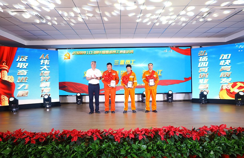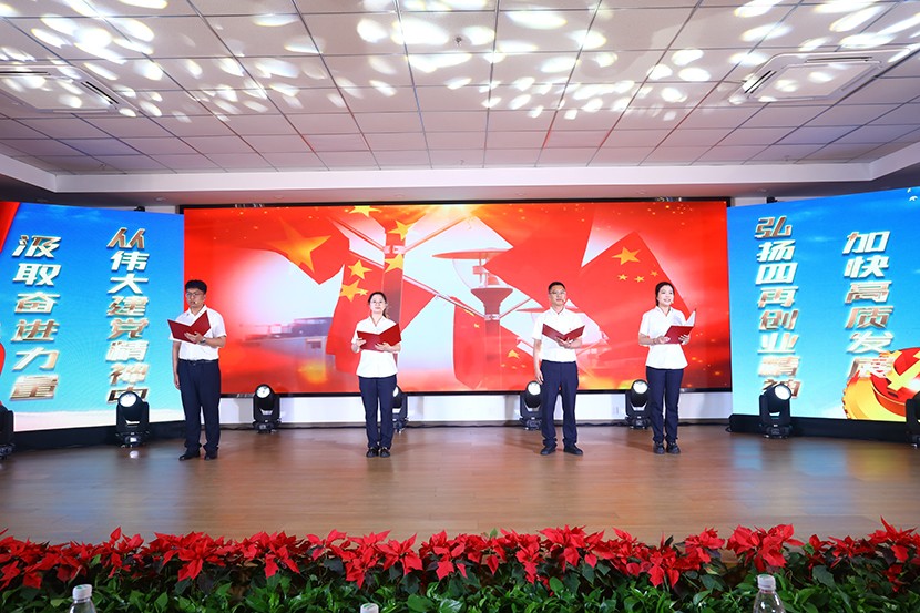 演出中,陳大壹、宋思雯、閆佳俊等十名新發(fā)展的中共預(yù)備黨員和新老黨員代表進(jìn)行了現(xiàn)場(chǎng)宣誓,并合唱《我宣誓》。對(duì)公司黨委評(píng)選出的星級(jí)員工進(jìn)行表彰,并對(duì)三星級(jí)員工進(jìn)行了專(zhuān)訪。