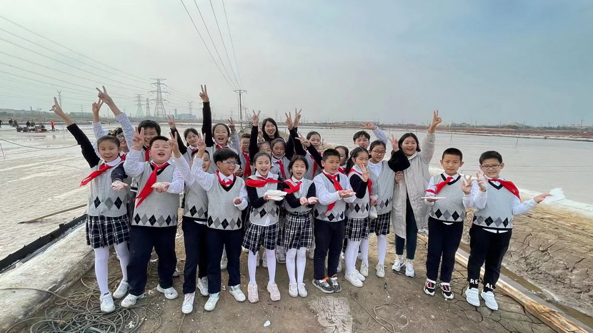 同學(xué)們近距離感受淮鹽的生產(chǎn)過(guò)程,聽(tīng)老鹽工講述過(guò)去收鹽的故事。為了感受鹽工的辛苦,同學(xué)們還興致勃勃地穿上膠鞋,來(lái)到鹽池中,用耙子扒鹽,用鏟子將結(jié)晶的鹽堆成堆,用手觸摸鹽的質(zhì)地,觀察鹽的結(jié)晶形狀……同學(xué)們不禁感慨小小鹽粒的來(lái)之不易。