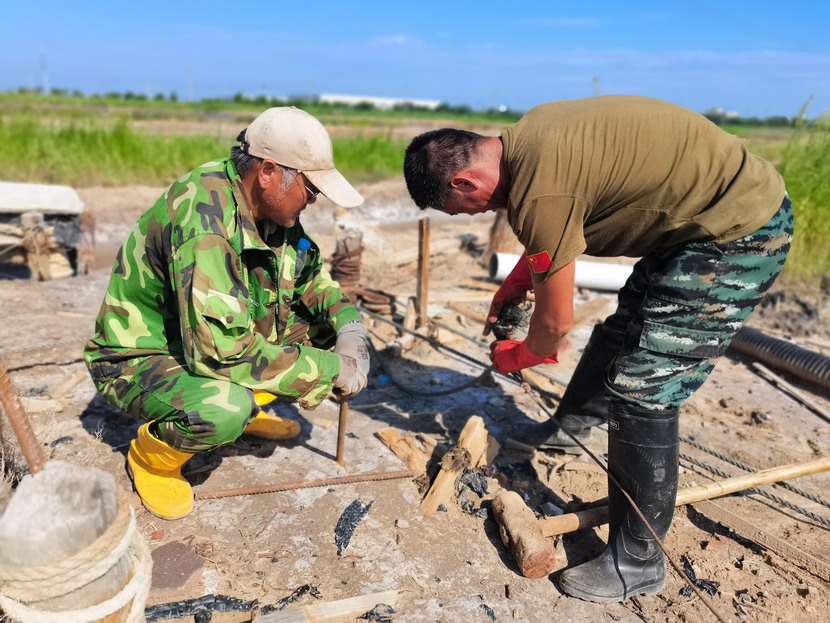 來到海州灣公司灘頭,遠遠望見幾名職工在鹽池里勞作,走近一看,組長夏軍正帶領一組人整修塑苫池。“我們5點就出來了,趁早涼,趕緊把塑料布整理一下,布子上都是鹵,長了鹽就不好處理了,搞不好這鹵水還會淌到外面去,造成浪費......”邊說著邊用肩膀頭子蹭一下眼角的汗水,手里的活一直沒停。據(jù)了解,海州灣公司承接臺北礦鹽和鈣液兩大產(chǎn)業(yè),經(jīng)濟比重占全公司收入60-70%,當前雖然是高溫期,但是廣大職工搶抓汛期難得的晴好天時,每天清晨5點就在灘地上忙碌起來,汗水模糊了雙眼,額頭的汗水順著帽檐往下滴落,身上的衣服一直都是濕漉漉的,緊貼在身上,即便如此,他們也毫不在意,用他們的話:“看著池子里每時每刻都在落鹽,這點汗就沒白淌啊!”我們臨走的時候,夏軍還不忘說:“今年我們保證鹽量突破2萬噸,不虧損?!?/span>