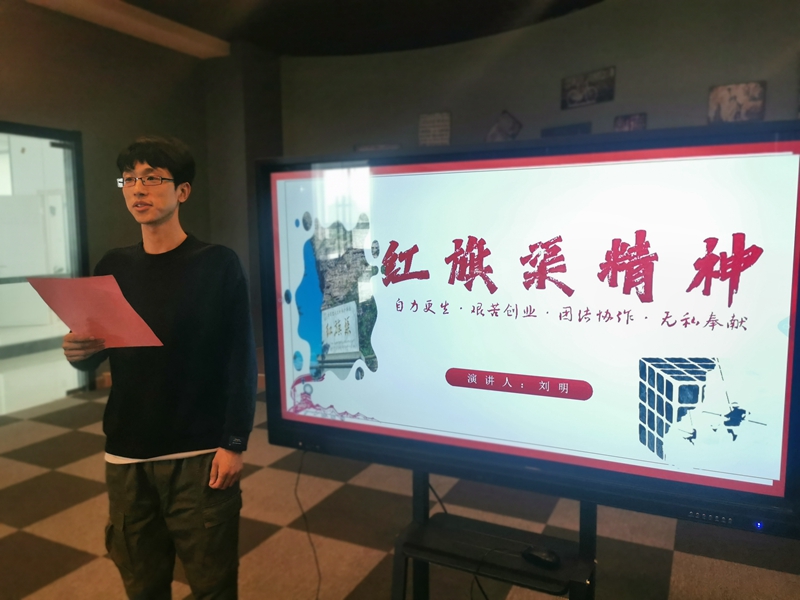 一場演講比賽——“自力更生、艱苦創(chuàng)業(yè)、團結(jié)協(xié)作、無私奉獻(xiàn)”,青年職工走上講臺,述說著勤勞勇敢的30萬林州人民,苦戰(zhàn)10個春秋,僅僅靠著一錘,一鏟,兩只手,在太行山懸崖峭壁上修成了這全長1500公里的紅旗渠的奮斗故事。